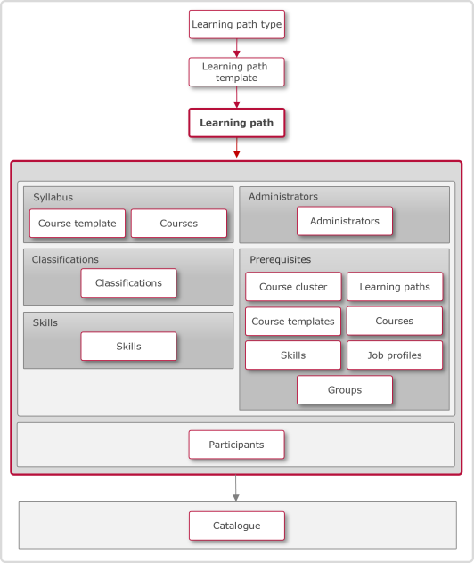 Learning paths are based on versioned learning path types, in which properties (metatags and attributes, use of classifications, skills, logic and requirements, cancellation fees) were already defined. These properties can be edited again upon creating a learning path.