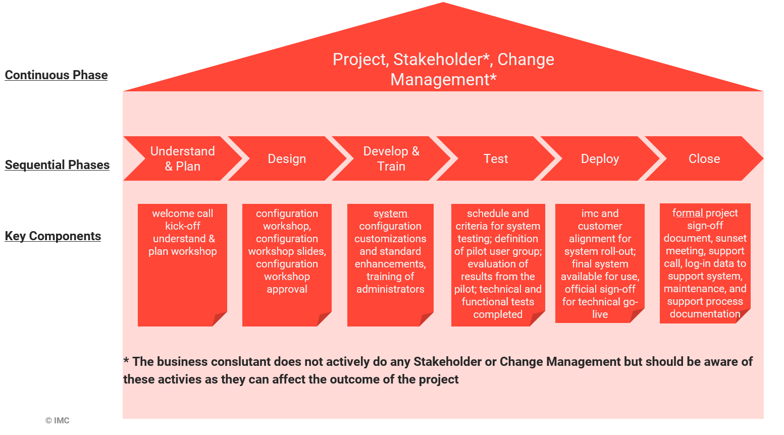 The Implementation Services Overview is a complimentary part to imc's LMS Implementation Methodology Guide as it provides an additional transparent overview of the included, excluded, and optional packages of the implementation as well as tasks. This Implementation Services Overview is perfectly aligned with the LMS Implementation Methodology Guide following the same structure using the Project Life Cycle and it's phases in addition to using the terminology as set forth by the PMI standards. The main goal of this overview is to allow an insight into imc's standardised structure of services in combination with clear expectations for customers (included and excluded services).