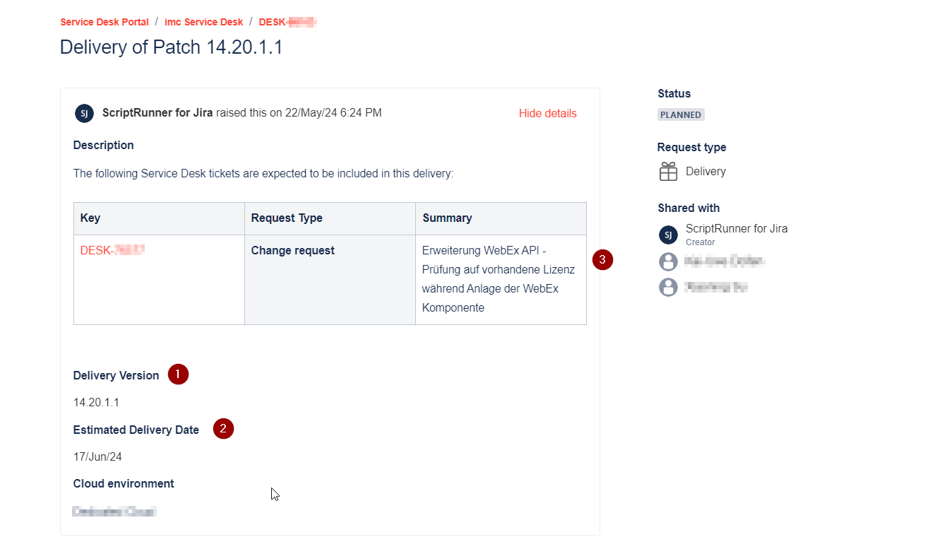 Tickets of type Delivery are created by the support team during the planning and preparation of patch deliveries. They are used to provide further information about the delivery contents and to schedule appointments and inform about delivery dates.